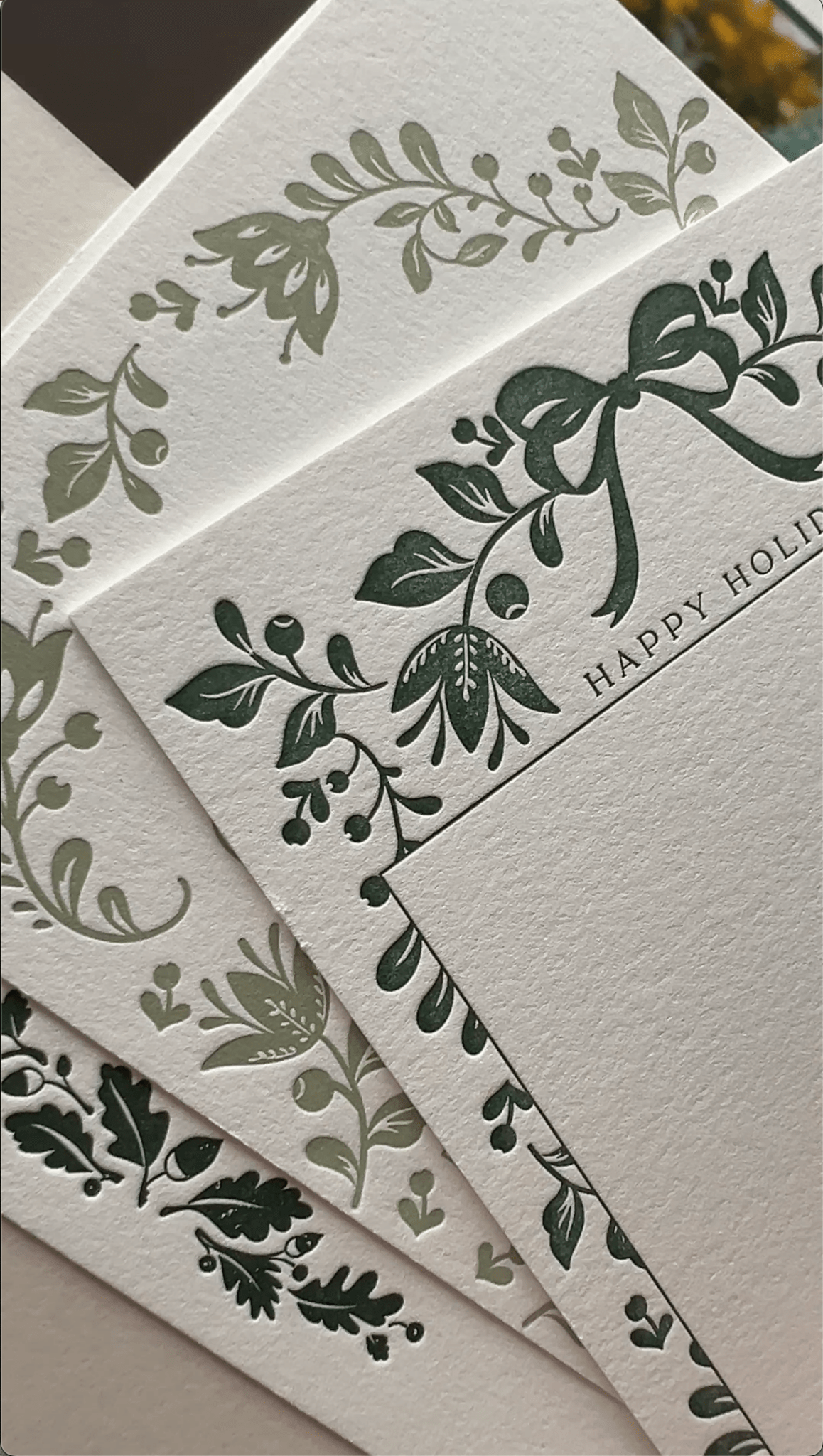 Embellishments such as return address printing, recipient addressing, envelope liners, wax seals and gift tags are available to match your design. Handmade heavyweight letterpress paper is also available as an upgrade while supplies for the season last. We have a limited stock available for the holidays so it is first come, first served.