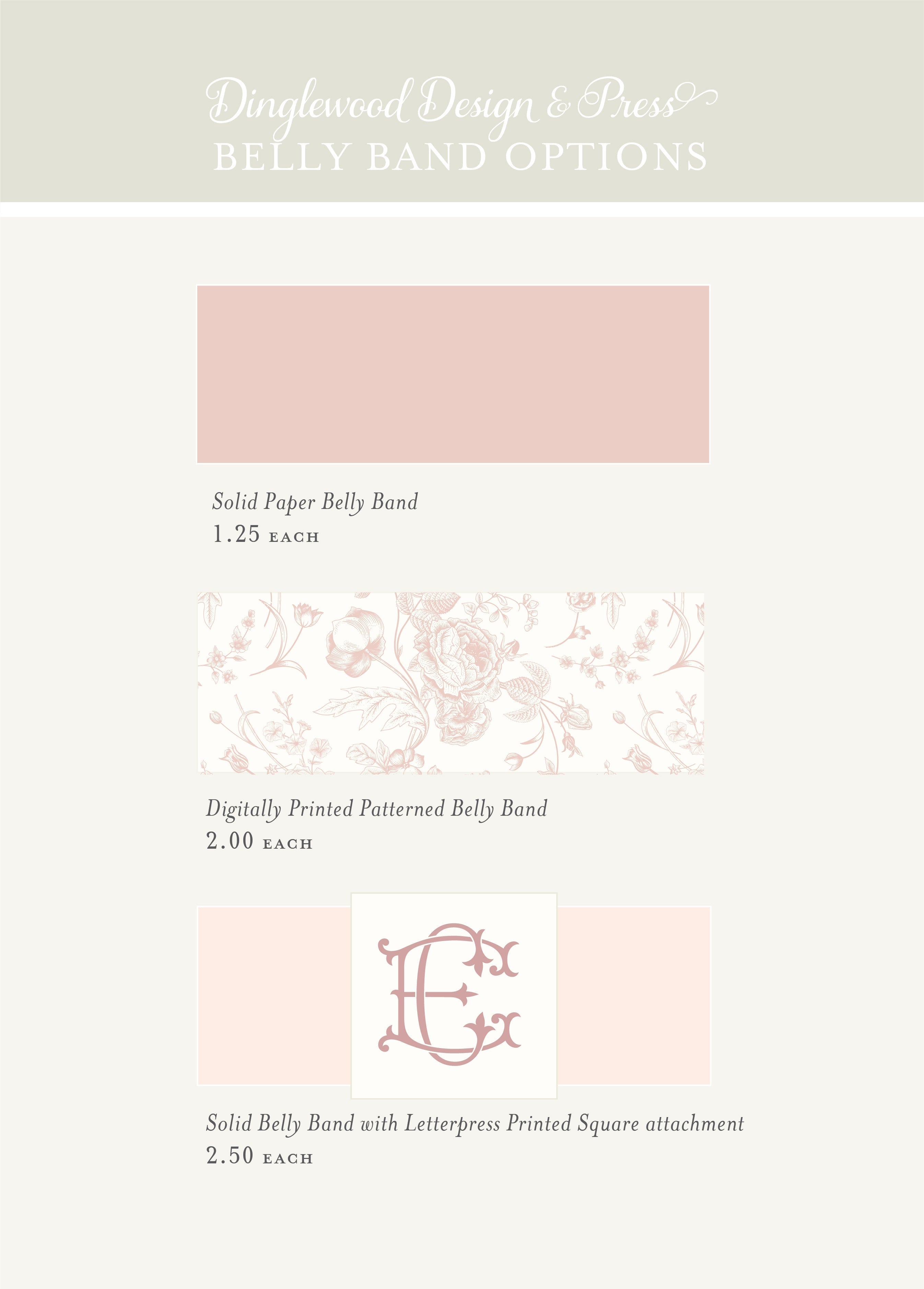 Invitation suites are sold as a customizable package. Only the options you select will be included in your suite. Text, envelopes, pocket enclosures, belly bands, backers and envelope liners are color customizable. Wording is also totally customizable.